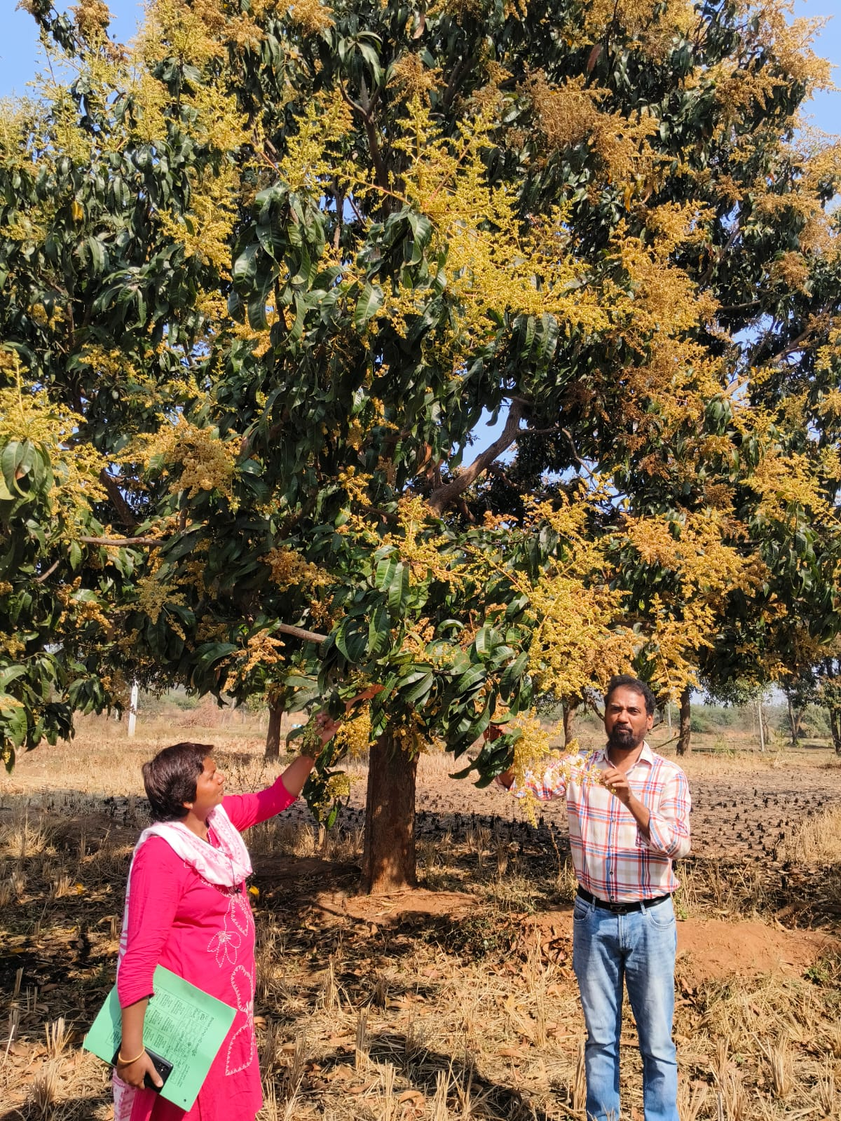 మెదక్ జిల్లా హవేలీఘనాపూర్ మండలంలోని ఫరీద్పూర్ గ్రామంలో రైతుల పలు మామిడి తోటలను పరిశీలించారు. రైతులతో మాట్లాడుతూ పోతదశలో తీసుకోవాల్సిన జాగ్రత్తలపై పలు సలహాలు సూచనలు అందించారు.ఈ సందర్భంగా ఉద్యానవన శాఖ అధికారి ప్రతాప్ సింగ్ మాట్లాడుతూ మామిడిలో పూత, కాయ ఎదుగుదలకు తక్కువ వర్షపాతం తక్కువ తేమ అవసరం. వర్షపాతం, ఉష్ణోగ్రత, తేమ, గాలి, సూర్యరశ్మి మామిడి చెట్లను వివిధ దశలలో ప్రభావితం చేస్తాయి. పంట పెరుగుదల, ఉత్పాదకతలో ఇవి ప్రధానపాత్ర పోషించి పంట ఉత్పత్తిని నిర్ణయిస్తాయి. మామిడి పండించే అన్నిప్రాంతాలలో పూత, కాయ ఎదుగుదల, రుచి అనేవి ముఖ్యంగా వాతావరణంపై ఆధారపడి ఉంటాయి.మామిడి పూతసమయంలో వర్షపాతం చాలా కీలకం. మామిడి పండు పెరుగుదల, అభివృద్దికి నెలవారి వార్షిక వర్షపాతం చాలా ముఖ్యమైనది. సాధారణంగా మామిడిలో పూత డిసెంబర్ రెండవ వారం నుండి జనవరి మొదటి వారంలోపు ప్రారంభమవుతుంది. ఉష్ణోగ్రత పెరుగుతున్న కొద్దీఆలస్యంగా పూతకు వచ్చిన కొమ్మల్లో మగపుష్పాలు అధికంగా ఏర్పడతాయి. 14°C కంటే తక్కువ ఉష్ణోగ్రతలు ఉన్నప్పుడుపూత ఆలస్యంగా వస్తాయి. పూతకు రాని తోటల్లో, తేలికపాటి తడులు ఇచ్చినట్లయితే పూమొగ్గలు విచ్చుకొని పుష్పగుచ్చాలు ఏర్పడతాయి. పూమొగ్గలువిచ్చుకొని పుష్పగుచ్చాలు ఏర్పడతాయి. పూమొగ్గలు పిందెగా మారుతున్న దశలో చెట్లకు నీరు ఇవ్వడం మొదలుపెట్టి, ఎరువులు వేసుకొని క్రమం తప్పకుండా నీరు ఇచ్చినట్లయితే త్వరగా పిందె కడుతుంది, కట్టిన పిందె రాలిపోకుండా కాపాడుకోవచ్చు. రాత్రి ఉష్ణోగ్రత 10°C కంటే తక్కువ ఉంటే, గాలిలో తేమ ఎక్కువ ఉన్నా కూడా పూతపై ప్రభావం చూపిస్తుంది, రాత్రి ఉష్ణోగ్రత 15°C కంటే ఎక్కువ ఉన్న పగటి ఉష్ణోగ్రత 25-30°C ఉన్న యెడల పుష్పాలు పగిలి పిందెలుగా మారతాయి. ఉష్ణోగ్రత లో వ్యత్యాసం, గాలిలో తేమ ఎక్కువగా ఉండుట వలన, అసమాన వర్షపాతం మరియు వాతావరణం పూత రావడంపై ప్రభావం ఉంటుంది. ముఖ్యంగా వాతావరణ పరిస్థితులలో పూత ఆధారపడి ఉంటుంది. రైతులు ఎటువంటి ఆందోళన పడాల్సిన అవసరం లేదు, తగు జాగ్రత్తలు పాటిస్తూ మంచి దిగుబడులు సాధించవచ్చు.