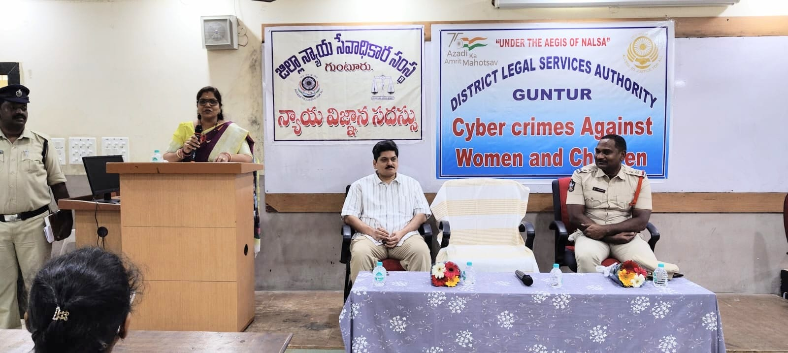 గుంటూరు జరిగినటువంటి ఒక కార్యక్రమంలో జిల్లా న్యాయ సేవాధికార సంస్థ చైర్మన్ గౌరవనీయులు శ్రీ సాయి కళ్యాణ్ చక్రవర్తి గారి ఆదేశాల మేరకు విద్యార్థులు సైబర్ నేరాల పట్ల తప్పనిసరిగా అవగాహన ఉండాలని ఐదవ అదనపు సివిల్ జడ్జి గౌరవనీయులు శ్రీమతి లతా గారు అన్నారు.