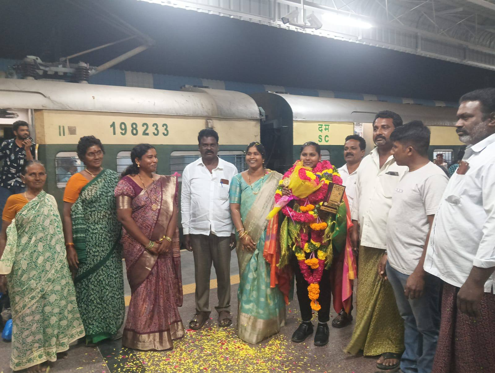 చీరాల: డిల్లీ లో 01/02/2026 నుండి 03/02/2026 వరకు జవహర్ లాల్ నెహ్రూ క్రీడా ప్రాంగణంలో నిర్వహించిన రెండవ షూటింగ్ బాల్ ప్రపంచ కప్ పోటీలలోబంగారు పతకం సాధించిన బాపట్ల జిల్లా వాసి పి. అనురాధ రెడ్డికి బాపట్ల రైల్వేస్టేషన్లో ఏట్రవారిపాలెం గ్రామ సర్పంచి అయిన చీరాల వెంకట లక్ష్మి గారు మరియు జిల్లా షూటింగ్ బాల్ సెక్రెటరీ నాగలక్ష్మి, జాయింట్ సెక్రెటరీ చీరాల నిర్మలా గారు మరియు గ్రామ పెద్దలు చీరాల శ్రీనివాస రెడ్డి, చీరాల నాగిరెడ్డి, ఏట్రా ప్రసాద్ రెడ్డి, చీరాల సూర్యనారాయణ రెడ్డి, చీరాల రామకృష్ణ రెడ్డి, మరియు టిడిపి పార్టి సీనియర్ నాయకుల అయిన శ్రీ ముసలయ్య గార్లు అభినందనలు తెలియజేసి ఘన స్వాగతం పలికారు.