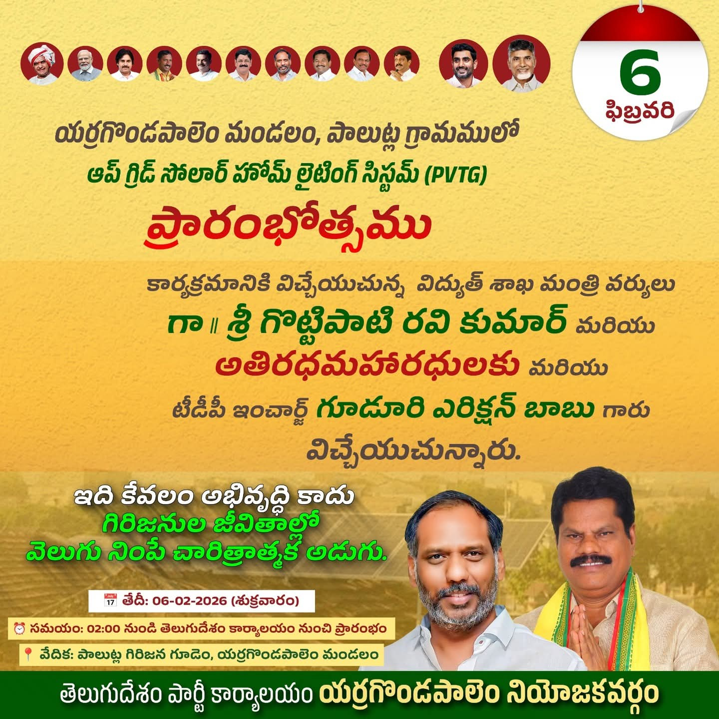 ఈ నెల 6వ తేదీ సాయంత్రం 4 గంటలకు యర్రగొండపాలెం మండలం పాలుట్ల గిరిజన గూడెంలో చారిత్రాత్మక కార్యక్రమం నిర్వహించబడుతోంది.