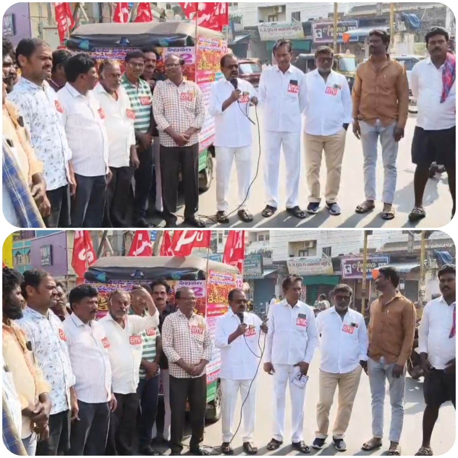 దేశ వ్యాప్త సమ్మెలో భాగంగా. ఫిబ్రవరి 12. తేదీ న సమ్మెను జయప్రదం చేయాలని కోరుతూ. ఊర్మిల సుబ్బారావు నగర్ నుండి. ఆల్ ట్రేడ్ యూనియన్స్. ప్రచార జాతా .బయలుదేరింది. కబేలా సెంటర్. చర్చి సెంటర్. ఐరన్ యాడ్. గొల్లపూడి హోల్సేల్ మార్కెట్ సెంటర్. సితార సెంటర్. కుమ్మరిపాలెం వీధి. బ్యాంకు సెంటర్. నాలుగు స్తంభాల రోడ్డు. మల్లికార్జున పేట బ్రాహ్మణ వీధి ముగిసింది.. ఈ కార్యక్రమంలో. ఏఐటియుసి. నగర కార్యదర్శి కొట్టు రమణారావు. నగర అధ్యక్షులు. కె.ఆర్ ఆంజనేయులు. ఉపాధ్యక్షులు. సిహెచ్ మారుతి. నగర ఏఐటీయూసీ నాయకులు. ఎస్ కే భాష .రామస్వామి. దేవర శ్రీనివాసరావు. శ్రీరామ్ మూర్తి. సి ఐ టి యు సి . ఎన్టీఆర్ జిల్లా. అధ్యక్షులు వెంకటేశ్వరరావు. సిఐటియుసి నగర కార్యదర్శి. నారాయణ. చౌదరి. సూరిబాబు. వివిధ కలనాయకులు పాల్గొన్నారు.. ప్రచురణార్థం..