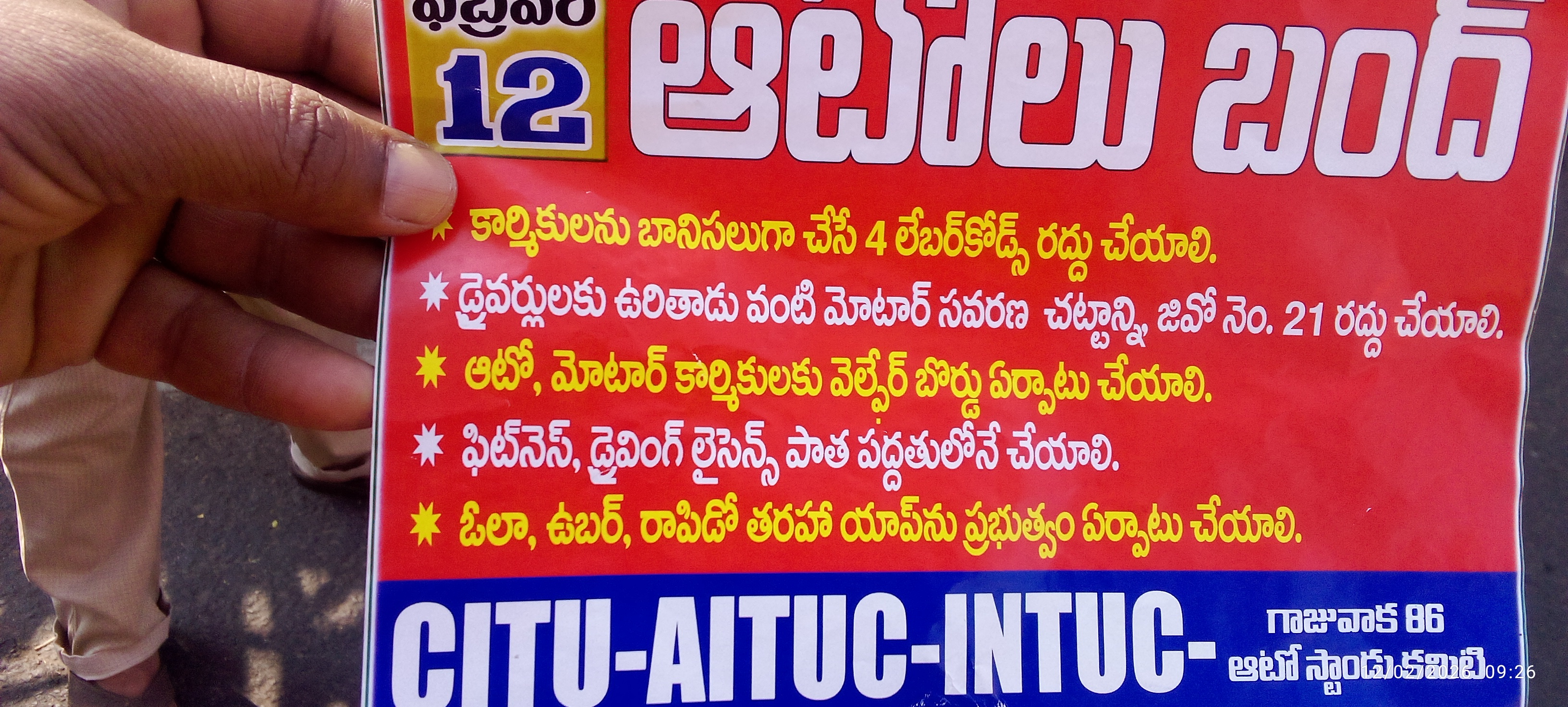 విశాఖ పట్నంలోని ఏ వియన్ కాలేజీ రోడ్డు అంబేద్కర్ విగ్రహ నడి కూడలిలో ఈ రోజు దేశ సమ్మె కారణంగా ఆటో డ్రైవర్లు సమ్మె చేశారు .ఆటో డ్రైవర్లు దాదాపు 50 మంది సమ్మెలో ఉన్నారు. ఆటో సంఘాల అధ్యక్షులు మీసాల కుమార్ కార్య దర్శి వడ్డాది బాబ్జిలు మాట్లాడుతూ కార్మికులను ప్రభుత్వం బానిసలుగా చూపుతుందని 4 లేబర్ కోడ్లు రద్దు చేయాలన్నారు. ఆటో మోటార్ కార్మికులకు వెల్ఫేర్ బోర్డు ఏర్పా టూ పాత పద్ధతిలో పిట్ నెస్ డ్రైవింగ్ లైసెన్స్. జి ఓ .ఇవ్వాలని ఓలా. ఉబర్. రా పిడో యాప్ ను ప్రవేశపెట్టాలని. పెరుగు తున్న నిత్యా వసర వస్తువూ లు కారణంగా వాహన మిత్ర పథకం 15వేలు నుండి 30 వేలకు పెంచాలని అన్నారు పలు సంఘాలు ఐ ఎన్ టీ యూ సీ. సి ఐ టీ యూ. ఏ ఐ టీ యూ సీలు పాల్గొన్నాయి