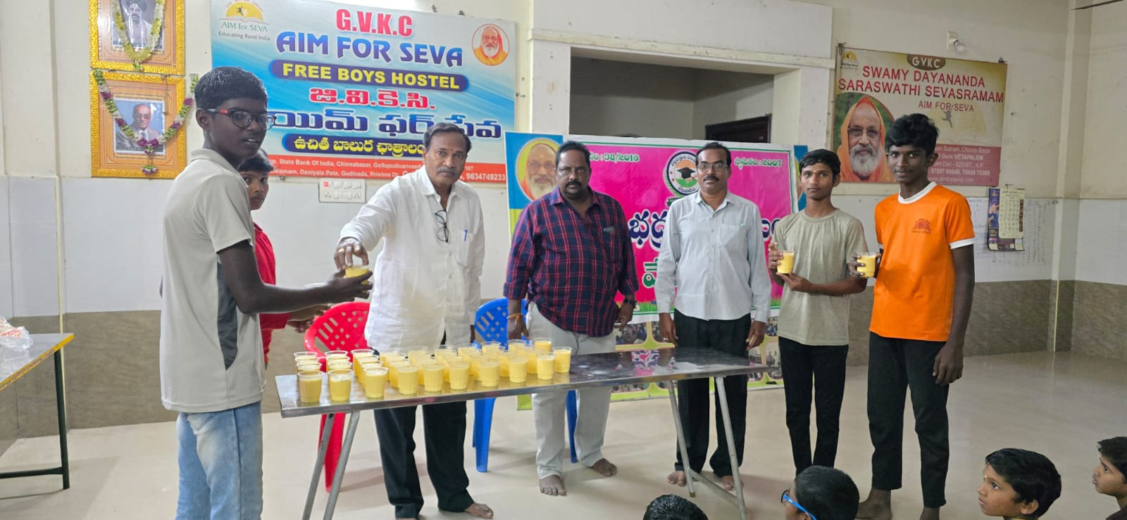 చీరాల: జీవికేసి స్వామి దయానంద సేవాశ్రమం నుందు గల విద్యార్థులకు వేటపాలెం మండల ఆర్యవైశ్య సంఘం అధ్యక్షులు మరియు రావులపేట పంచాయతీ వార్డ్ మెంబర్ వుటుకూరి కోటి స్వామి గుప్త పౌష్టికాహారము మరియు మానసిక తృప్తి కోసము అల్పాహారం క్రింద బాదంపాలు పంపిణీ చేయడం జరిగినది. ఆశ్రమ విద్యార్థులు స్వామి దయానంద ఆశీస్సులు కలగవలెనని ప్రార్థించినారు. కార్యక్రమంలో ఇంటర్నేషనల్ వైశ్య ఫెడరేషన్ రాష్ట్ర సెక్రెటరీ ప్రత్తి వెంకట సుబ్బారావు సేవకు సుబ్రహ్మణ్యం లక్ష్మి పాల్గొన్నారు.