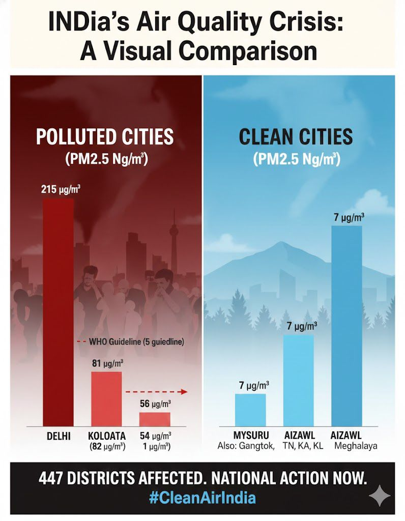 The December 2025 Reality Check: Delhi-NCR: Hazardous (AQI 461+). Schools closed, WFH in effect. Kolkata: Choking under a "diesel legacy" and stagnant winds. Bengaluru: The "Garden City" isn't safe—AQI spiked to 200 last month. The Clean Spots: Mysuru and Shillong are among the few still breathing easy.