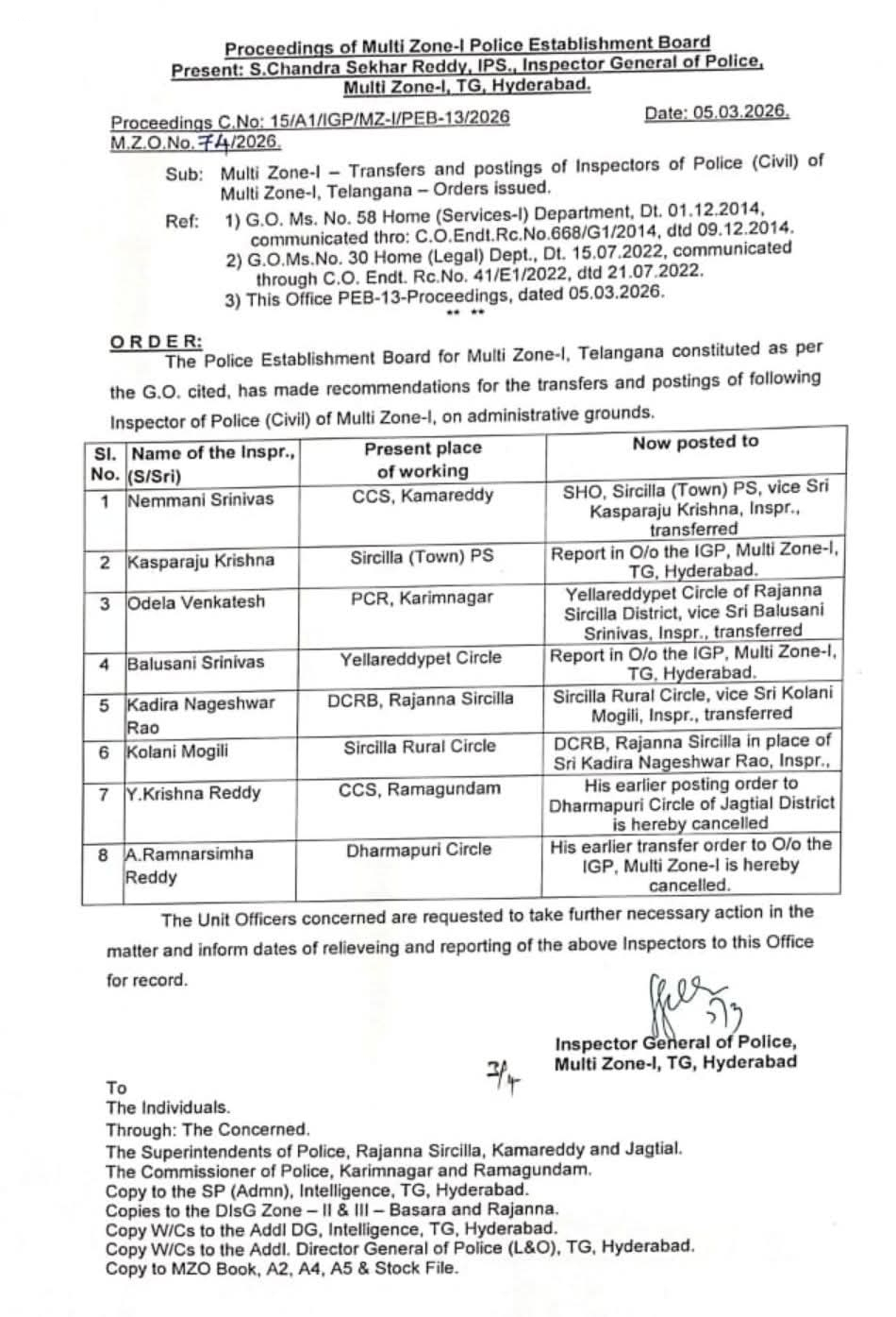3.సిరిసిల్ల రూరల్ సర్కిల్ ఇన్స్పెక్టర్ గా ఉన్న మొగిలిని డిసిఆర్బికి బదిలీ..